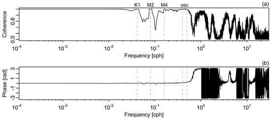 Spectral analysis of the sea level time series employed the smoothed-periodogram method provided by the spectrum function of the stats R package (version 4.5.0), using a modified Daniell filter with the spans parameter equal to for the smoothing. This yielded an effective bandwidth of cph, i.e., times the difference in and frequencies. See Chapter 4 of [15] for more on smoothing procedures, and spectral analysis in R, generally. Cross-spectral analysis was performed with the mvspec function of the astsa R package [16], with the same smoothing parameters as were used for the single-component case. A frequency–time diagram was constructed by splitting the data into 1-day segments and then computing spectra with spans set to , yielding an effective bandwidth of cph, i.e., 21 times the difference between the and frequencies.