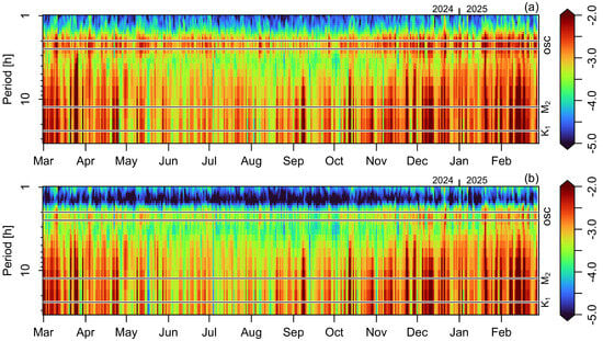 Temporal variation in power spectra of de-tided sea level records at tide gauges #491 and #490, in panels (a,b), respectively. The spectra are computed daily from the 1 min data, with only periods in excess of 1 h being shown here. Colour indicates the base-10 logarithm of spectral density, in . The and periods (ill-resolved for daily windows) are indicated with horizontal lines, along with the oscillation band from the to h period.