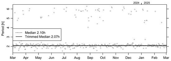 Visual inspection of Figure 8 suggests that the oscillation period does not change appreciably through the year. To check this, the data (again, with oscillation period h) were subjected to least-squares regression using a model assuming sinusoidal variation with a 1 y period. The resultant p value of greatly exceeds the commonly used threshold of , indicating a lack of statistical significance. Furthermore, the adjusted value reveals that only % of the signal variance is explained by this model of seasonal variation in oscillation period.