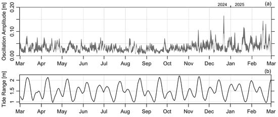 (a) Complex demodulation amplitude for tide gauge #491, computed in daily subsets. The filled region extends from the median value to that of the 95-th percentile. The prominent spike in December 2024 is for the event shown in Figure 2. (b) Tidal range, again computed in daily subsets, as an indication of the spring-neap cycle.