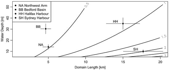 Figure 10 shows the prediction of the seiche oscillation period using Equation (1) for Bedford Basin, for a larger domain comprising the basin together with the harbour, for the Northwest Arm, and for Sydney Harbour (311 km northeast of Halifax). The values of H and L were determined by inspection of published charts and should be considered approximations to within perhaps 15%. In the Northwest Arm and Sydney Harbour cases, the observed oscillation periods are consistent with seiche predictions (see [41,42], respectively, for prior work). The same cannot be said for Halifax Harbour, however, since reasonable adjustments to H and L cannot yield a 2 h period.