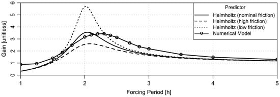 In the present context, it is worth noting that the oscillations tend to be highly coherent between the two tide gauges in the domain, which suggests that this is a harbour-scale response. The observed oscillation period ( h) is not consistent with seiche theory, but it is in good agreement with Helmholtz resonator theory ( h ± h) as well as with a 2D numerical model that handles realistic bathymetry and computes bottom stress using the law of the wall ( h). The gain function of the Helmholtz theory tends to be somewhat more peaked than that of the numerical simulation, which is perhaps unsurprising, given the detuning that is likely to result from flow in the complex domain in the latter case.