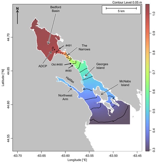 Bathymetry data were downloaded in the NONNA (non-navigational) format from the Canadian Hydrographic Service (CHS) website [11]. The highest-resolution datasets were selected, yielding approximately 10 m between samples. The NONNA values are defined with respect to a Chart Datum that is below mean (de-tided) sea level, and so m was added to the NONNA value to calculate water depth. The results were then averaged onto a grid (with easterly and northerly spacings of 21 m and 23 m) using the binMean2D function of the oce R package [12]. A terrain-following coordinate system was devised for the region of The Narrows to facilitate the determination of mean water depth and cross-sectional area in the channel.