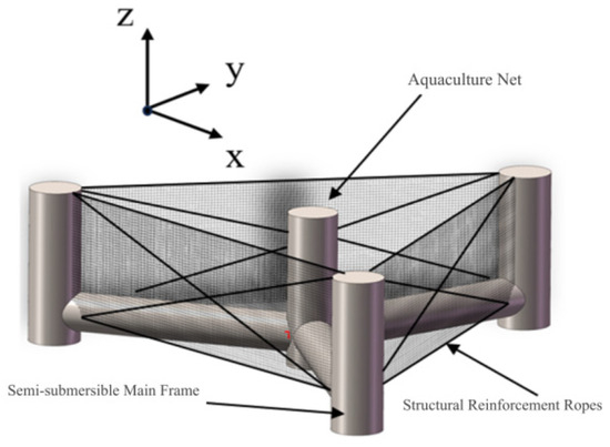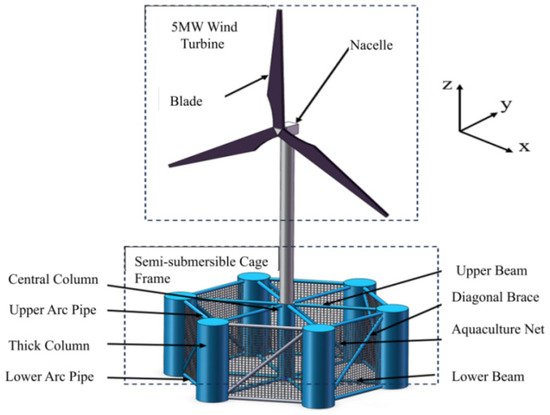 In recent years, the resource constraints in nearshore waters and environmental pollution issues have spurred the demand for large-scale development of deep-sea aquaculture [1,2]. Driven by global energy transition strategies and blue economy initiatives, the integrated development of offshore floating wind power and deep-sea aquaculture has emerged as a cutting-edge direction for comprehensive marine resource utilization [3]. This composite structure enhances resource utilization efficiency through shared mooring facilities and optimized spatial allocation of marine areas, while simultaneously reducing operational cost [4,5,6]. It is demonstrated that border marine space and superior water quality condition in deep-sea region could be crucial to increase the production of healthy fish [7,8]. Therefore, these environmental advantages concurrently are beneficial to lower disease incidence rates in fish populations and to decrease feed wastage [9,10]. Germany was the first to conduct small-scale algae cultivation experiments in the North Sea wind farm as early as 1990. However, due to technical limitations, the early grid system was insufficient in strength under harsh sea conditions [11,12]. Furthermore, in 2016, South Korea initiated the construction of its first large-scale offshore wind farm integrated with seaweed and shellfish cultivation off its southeastern coast. This project aimed to develop a tension leg platform (TLP) combined with a seaweed cultivation system [13]. The semi-submersible platform to be put into operation in Fujian, China in 2024 marks the birth of the world’s first commercialized wind-fish integration project, innovatively achieving the integrated integration of the wind turbine foundation and the cage aquaculture system.
