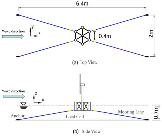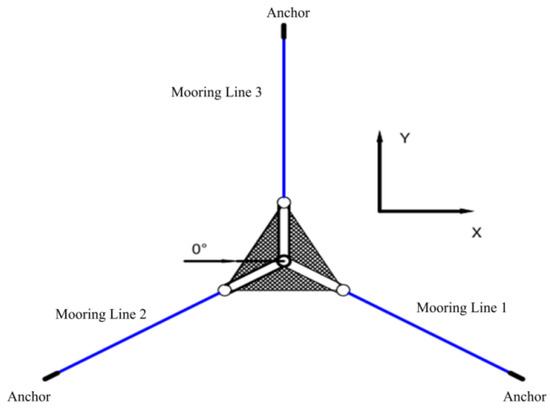 For the mooring system, a taut mooring system was adopted, the length of the anchor chain was 3 m and the water depth was set at 0.7 m. The specific parameters of the mooring system are presented in Table 3, and the mooring arrangement is illustrated in Figure 3.