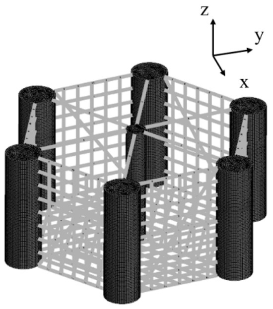 The cross-section of the bar based on the Morrison model is circular. The Morrison bar in this study is modeled as a slender cylinder, with added mass coefficient of 0.75. According to the above volume equivalent method, length and diameter of equivalent single wire is respectively 3.6 m and 4.1 cm and density of the wire is 0.94 g/cm3, water depth is 200 m. The schematic configuration of the integrated wind turbine-cage foundation is comprehensively illustrated in Figure 9. The hydrodynamic parameters are summarized in Table 6.