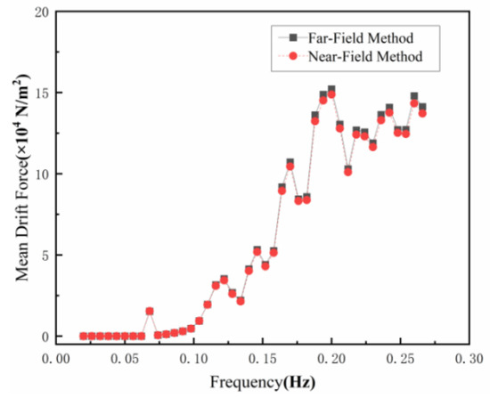 To ensure the accuracy of mesh generation, convergence analysis should firstly be conducted. Typically, the computational results of second-order mean drift forces obtained through near-field and far-field methods can be compared to verify their consistency, which serves as an indirect indicator of mesh convergence. When the wave incidence angle is 0°, the mean drift forces in the surge degree of freedom direction of the wind turbine-cage platform calculated by both near-field and far-field methods are presented in Figure 5. As shown in Figure 5, as the calculation results of the near-field method and the far-field method are basically consistent, therefore, mesh convergence is good.
