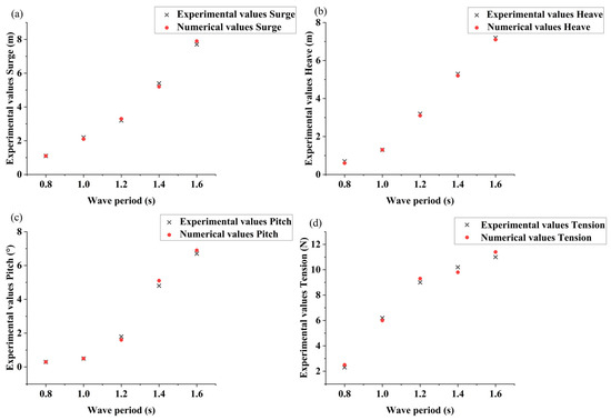 A comparative analysis was conducted between the structural motion responses and mooring line forces obtained through numerical simulations and experimental results as shown in Table 5 and Figure 6. Hydrodynamic responses including surge motion, heave motion, pitch motion of the structure and tension of the mooring line on the wave-facing side were respectively compared with the experimental results under corresponding working conditions.