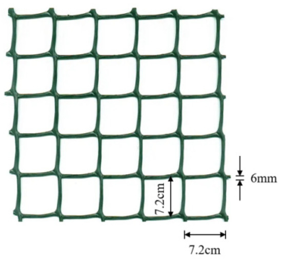 To ensure the service life of the net under long term exposure to seawater, reinforced high-strength polyethylene (HDPE) was selected as the primary material of the net. The reinforced HDPE formulation does not only demonstrate excellent resistance to seawater corrosion, but also has a relatively high tensile strength, which can effectively resist the tension exerted by current and marine biofouling on the netting system. The grid shape of the selected net system is square, the diameter of one net wire is 6 mm and side length of a single net wire is 7.2 cm as shown in Figure 8. According to Equation (5), areal density of the netting is equal to 1.48 kg/m2 and solidity ratio of net system is 0.16.