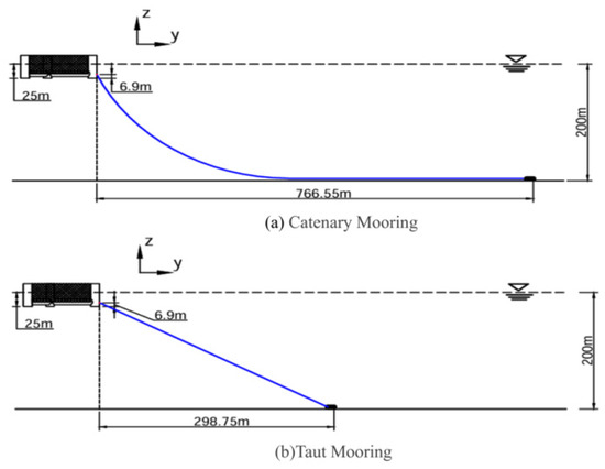 For the computational environmental conditions, the China Classification Society (CCS) Rules for Classification of Offshore Floating Installations were referred to CCS [48]. The one-year recurrence period sea conditions in the northern part of the South China Sea with a water depth of more than 150 m are selected as the operation sea conditions and the 25-year recurrence period sea conditions are selected as the self-existing sea conditions. The wave load adopts the JONSWAP wave spectrum. The wind speed is considered as constant wind that is calculated based on the one-hour average wind speed at a height of 10 m above the average sea level. Current loads are considered as constant flow and uniform flow. Detailed parameters of the selected environmental conditions are listed in Table 9.