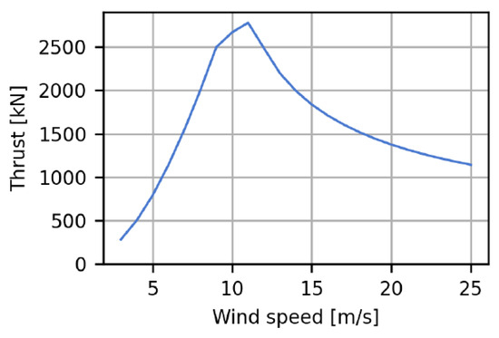 Thrust versus wind speed curve of the 22 MW Wind Turbine.