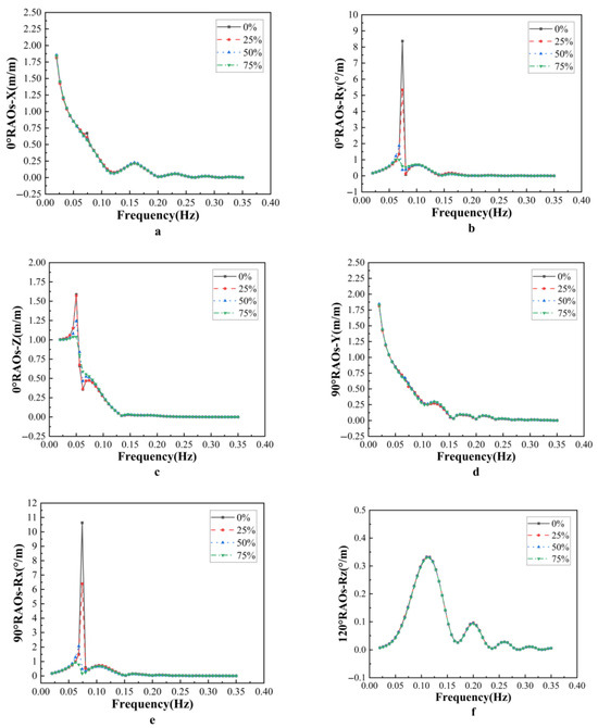 Roll RAO responses of this structure under a wave direction angle of 90° could be obtained in Figure 14e. Roll RAO responses go up rapidly with frequency increases in low frequency range of 0.02 to 0.07 Hz and their peak values occur in the vicinity of 0.07 Hz. The peak decreases to 11.1% of corresponding initial peak magnitude with ratios of biological fouling increase. In Figure 14f, yaw RAO responses of the structure under a wave direction angle of 120° are illustrated. The RAO curves for different ratios of biological fouling almost overlap throughout the entire frequency range. Yaw RAO reaches their peak at the magnitudes of 0.35°/m in the range of 0.1 Hz to 0.15 Hz. Yaw RAO magnitudes gradually decline to a stable value after higher than frequency of 0.15 Hz.