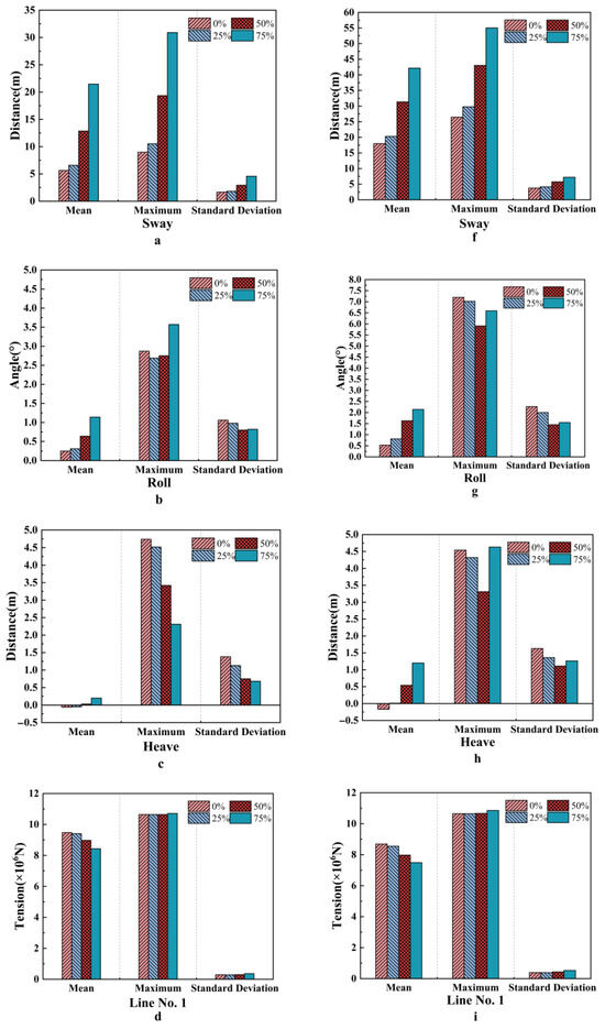 It can be known from Figure 16a,f that average and maximum values on the sway motion gradually increase with the increase of biological fouling under different sea conditions similar to the case in the catenary mooring. The maximum sway displacements under both sea states occur at 75% of biological fouling and are 9.68 m and 17.38 m, respectively. Figure 16b,g show that average and maximum values of roll motion exhibits similar trends to those of sway motion. Maximum roll values of this foundation under 75% of biological fouling are respectively 5.28° and 12.5° under the two sea conditions. Furthemore, maximum value of heave motion gradually decreases with the increase of the bioattachment degree under the operating sea condition with the increase of biological fouling in Figure 16c. it could be seen that maximum value of heave motion occurs at 0% of biological fouling and is 5.69 m. Mean heave displacement remains to be close to zero whereas the standard deviation gradually decreases with increase of biological fouling. Therefore, it could be estimated that increase of biological fouling enhances drag forces, thus narrows heave motion amplitude of this paltform. For the Figure 16h, it could be observed that maximum heave motion could reach its peak at 75% of biological fouling and its magnitude is 8.5 m under survival sea state.