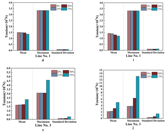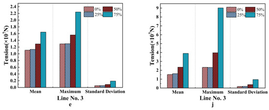 According to Figure 16d,i, average tension of Line 1 gradually decreases with the increase of biological fouling of the net cage under the two sea conditions, while maximum value is less affected by the biological fouling and always remains at about 3.34 × 104 kN and 3.32 × 104 kN respectively. However, the Line 3 is the main force-bearing cable due to the effect of the load direction, the average and maximum values of its tension gradually increase with the increase of biological fouling, therefore, the effect of 75% of biological fouling is most significant. Maximum tension of Line 3 under the working sea conditions is 3.32 × 104 kN with the safety factor of 2.35 complying with safety specification, which is 1.49 times than that of 50% of biological fouling as displayed in Figure 16e. Figure 16j shows that maximum tension of Line 3 at 75% of biological fouling under survival sea conditions is 1.31 × 105 kN. This tension increases by 244% compared with the tension without biological fouling and by 186% compared with the tension with 75% of biological fouling under operating sea conditions.