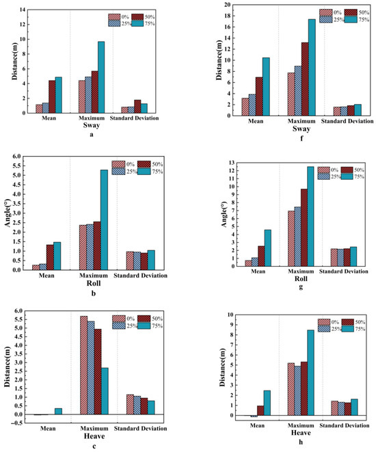 Figure 15b,g demonstrate that the mean displacement also increases with biofouling levels rise for the roll motion under the two sea conditions. At 75% of biological fouling, the mean values under both sea states reach their maxima of 1.14° and 1.2°, respectively. However, the standard deviations of roll response in both sea conditions gradually decrease with the increase of biofouling levels, which is related to the damping effect brought about by the increase of ratios of biological fouling. Figure 15c,h show that the average displacements at each ratio of biological fouling are relatively small for the heave responses, and the maximum values under the operating sea conditions decrease with the increase of ratios of biological fouling. Maximum heave motion of this integrated foundation structures of wind turbine and net cage under the operating sea conditions is 2.31 m occurring at 75% of biological fouling, only 49% of heave motion at 0% of biological fouling. Whereas maximum heave displacement increases to 4.63 m at 75% of biological fouling under survival condition.