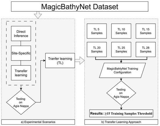 - Transfer learning: A two-stage fine-tuning approach was adopted, beginning with a model pre-trained on the Puck Lagoon (source domain) dataset and subsequently fine-tuned on the Agia Napa training set (target domain). This approach examined the capability of transfer learning to leverage both domain-specific information from a related geographic area. Furthermore, an additional evaluation was conducted to determine the minimal number of training samples from Agia Napa required to surpass performance baselines, systematically varying the training sample size from 5 up to the full set of 28 samples.