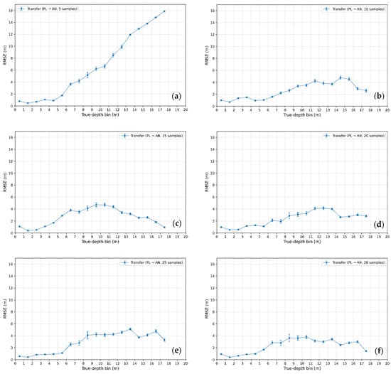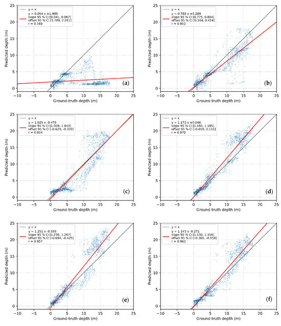 - Transfer learning (28 samples) (Figure 4f) demonstrated the most balanced and consistent predictions, with slope = 1.143 and intercept = −0.271 m, and a correlation coefficient of r = 0.963. Although the slope remains significant at >1, the residual depth-dependent error is ≤0.5 m at up to 18 m in depth.