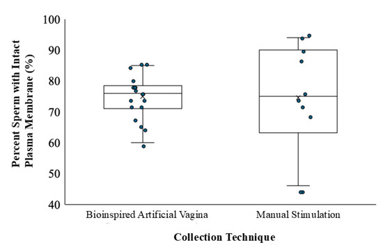 When semen was collected with BAVs, the mean (±SD) percentage of sperm with intact plasma membranes was 74.9% ± 6.92 (range: 60–85%, n = 1800 sperm; Figure 5). The mean (±SD) percentage of sperm with intact plasma membranes collected by manual stimulation was 74.5% ± 17.41 (range: 46–89%, n = 1000 sperm; Figure 5). The percentage and median of sperm cells with intact plasma membranes was not significantly different between collection methods (F = 12.08, p = 0.999, n = 2800 sperm; Table 1).