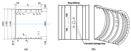 Specifically, for the RSC-CD-2-60, 80, and 100 series, the values were set to 60 mm, 80 mm, and 100 mm, respectively, while was maintained at 100 mm. For each corrosion case, the depths ( and ) were varied from 1.0 mm to 5.0 mm at 1.0 mm intervals. The same corrosion damage characteristics were applied to the RSC-CD-4-60, -80, and -100 series. This systematic variation resulted in a total of 32 numerical computation cases, encompassing a wide range of corrosion scenarios. The original models (RSC-CD-2 and RSC-CD-4) maintained their identical specifications of shell thickness (6.1 mm), mean diameter (1155 mm), and stiffener spacing (200 mm). Figure 3 provides a detailed description of the corrosion damages for the parametric study, and Table 1 summarizes the sizes of these damages in the numerical models.