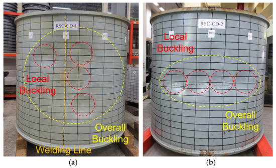 Collapse shapes of test models, showing intact and corroded failure modes: (a) RSC-CD-1 model; (b) RSC-CD-2 model [43].