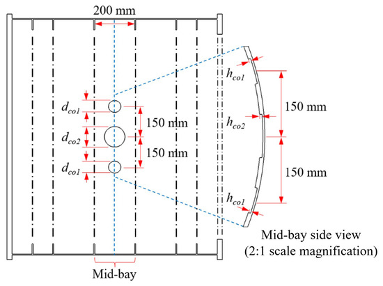 The corrosion damage was systematically varied by modifying both the diameter and depth of the artificially corroded areas. For the RSC-CD-2 and RSC-CD-4 series, the dimensions of the corroded areas were defined as follows: outer corrosion diameter () and depth (), and inner corrosion diameter () and depth ().