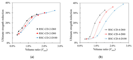 Parametric study results showing strength reduction against corrosion volume ratio: (a) RSC-CD-2 series; (b) RSC-CD-4 series [43].