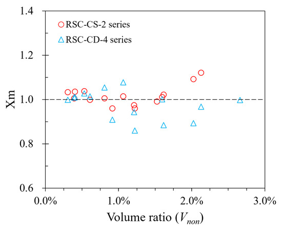 Based on the analysis of the parametric study results, a new strength reduction factor was empirically derived. The relationship between the strength reduction and the corrosion volume ratio was analyzed, and a best-fit curve was established. The derived equation for the corrosion strength reduction factor is given by the following: