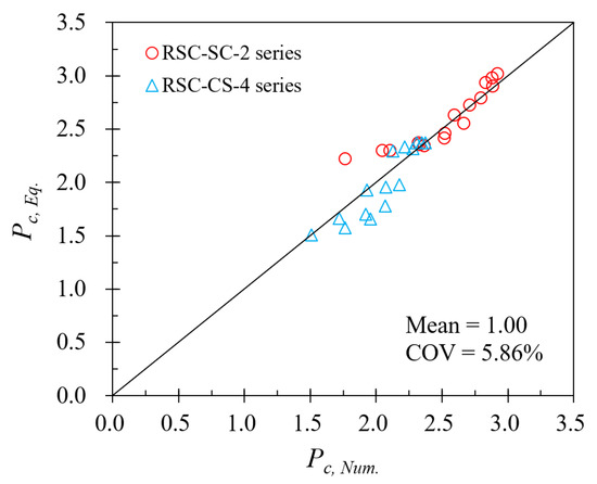For verification against experimental data, the collapse pressures predicted by the new design formula were compared with the actual measured collapse pressures from the corroded test models (RSC-CD-2 and RSC-CD-4) described in Section 3. The results, summarized in Table 2, showed excellent agreement. For RSC-CD-1 (intact), the difference between the proposed formula and experimental results was 2.3% (3.04 MPa vs. 3.11 MPa predicted). For RSC-CD-2 (corroded), the difference was 1% (2.85 MPa vs. 2.88 MPa predicted). Similarly, for RSC-CD-3 (intact), the difference was 2.7% (2.60 MPa vs. 2.53 MPa predicted). For RSC-CD-4 (corroded), the difference was 1.3% (2.28 MPa vs. 2.35 MPa predicted). Overall, the difference between the predicted collapse pressures and experimental results for corroded models was consistently within 1–3%.