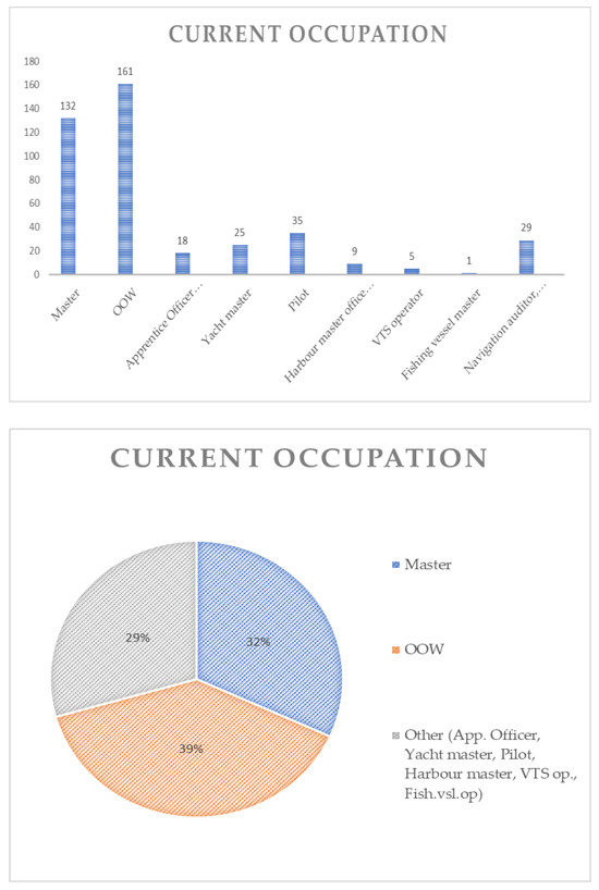 The data in Table 1 yields valuable insights into the occupational distribution and diversity of experience among respondents, giving us a solid data foundation. Most 415 respondents belong to the OOW category, closely followed by Masters, providing a strong experience base. These two categories account for a significant percentage, encompassing two-thirds of all participants, considering two core bridge team management roles. Additionally, other diverse specialized maritime professionals should also be pointed out, collectively presenting one-third of the surveyed population.