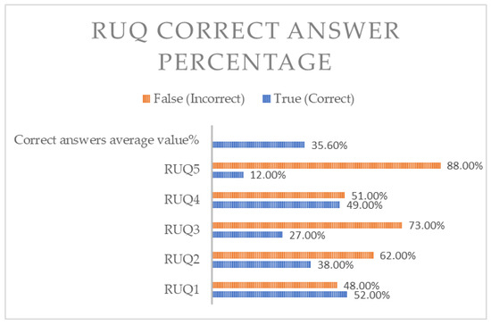 The data gleaned from the survey is consolidated in Figure 4, presenting the tally of accurate and inaccurate responses for each question (RUQ1–RUQ5), along with the corresponding percentage of correct answers and the aggregated average value. The chart highlights noticeable variation in respondents’ understanding of COLREG Rule 10 across five scenario-based questions.