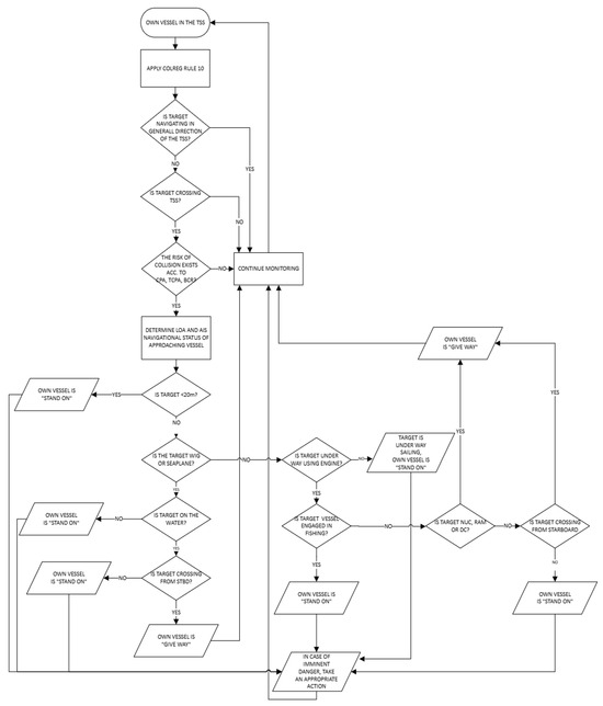 Due to the poor results from the previous chapter, the proposed DSS Architecture will consider only vessels entering and crossing the TSS and the OV bow. To solve responsibilities concerning collision avoidance, the first thing to consider for OV is whether she is navigating near or in the TSS, and for other vessels, are they crossing the TSS? Once the OV enters or is navigating in the TSS, the navigator should be aware of their surroundings, considering the potential risk of collision, and factors as CPA, TCPA, Bow Crossing Range (BCR), and AIS information regarding vessel type and navigation status. Therefore, the DSS Architecture continuously monitors vessel movement and reassesses collision risk dynamically. If no immediate risk of collision is detected, routine monitoring of the surrounding traffic situation continues. However, once the risk of collision is established, the DSS Architecture must classify the type and navigation status of the approaching vessel to take a proper course of action under Rule 10. When collision risk arises, COLREG Rule 15 assigns stand-on and give-way responsibilities among two vessels in a crossing situation. Considering COLREG rules, a crossing situation is any situation that is not head-on or overtaking when the risk of collision is involved. A vessel with the other vessel on her starboard side is considered a give-way and should take action to avoid collision and not cross the other vessel’s bow. As a result, in Figure 6, the proposed DSS Architecture suggests a give-way or stand-on solution in compliance with COLREGs Rule 16 (action by give-way vessel), Rule 17 (action by stand-on vessel), Rule 15 (crossing), Rule 18 (responsibilities between vessels), and Rule 7 (risk of collision) incorporated in Rule 10 (TSS).