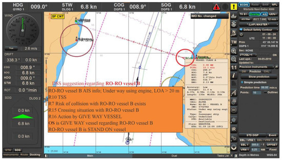 As part of the Integrated Navigation System (INS), the Electronic Chart Display and Information System (ECDIS) consolidates information from various sources into a single platform, offering a centralized navigation system for voyage monitoring. Considering this, it is essential to explore the integration of the proposed DSS Architecture with ECDIS. Despite the acknowledged complexity of the existing ECDIS [46] by several authors and concerns regarding overreliance and potential failures [47,48,49,50,51], there is a consensus that developing an integrated and comprehensive system is crucial for future navigational technologies. Given the advancement in maritime technology and recognized needs, the authors advocate for including a COLREG-compliant decision support tool as part of the INS to enhance collision prevention and bring the shipping industry one step closer to the MASS technology (degree One).