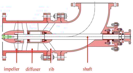 Axial flow pumps, as a blade-type piece of hydraulic machinery, are widely used in large-scale water transfer projects and propulsion systems of ships and submarines, which benefit from their advantages of large flow rate and high efficiency [1]. Axial flow pumps exhibit structural features that create a space between the impeller and the runner chamber wall. During blade operation, the pressure differential between the pressure and suction surfaces drives leakage flow through the tip clearance. Upon merging with the suction-side mainstream flow, this leakage flow develops into a distinct tip leakage vortex (TLV) [2]. When a TLV occurs, low-pressure areas can induce the formation of vortex cavitation. Severe cavitation may cause hydraulic excitation and noise, leading to the deterioration of pump performance [3,4,5,6,7].