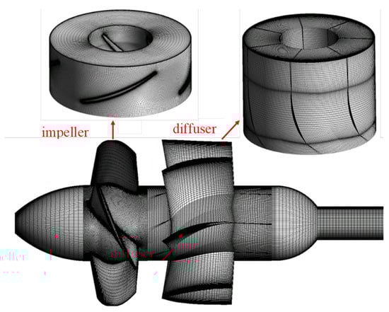 Before conducting numerical simulations, the model must be discretized into a mesh. The accuracy of the simulation depends on the quality of the computational mesh. The impeller design of the pump model is particularly complex. Local mesh refinement in the tip clearance and boundary layer zones is accomplished using hexahedral structured grids, which meet the wall function requirements of the turbulence model. This enables a more precise calculation and forecasting of the intricate flow patterns within the tip region, subsequently enhancing the accuracy of the computational results. In this paper, the preprocessing module ICEM in ANSYS 19.2 is used to discretize the computational domains into hexahedral structured meshes. As shown in Figure 2, the inlet section, rib, elbow pipe, and outlet section adopt an O-type topological structure, while the guide vane adopts an H-type topological structure. For the key hydraulic components of the impeller, the turbogrid meshing module is used to perform structured meshing. The mesh element counts for the inlet section, rib, elbow pipe, and outlet section are 540,432, 356,184, 354,913, and 521,652, respectively. The impeller and diffuser grids comprise 7,067,531 and 3,324,315 elements, correspondingly. As illustrated in Figure 3, the presentation encompasses the distribution of y+ values across the pressure surface, the suction surface of the blade, as well as the wall of the runner chamber. The y+ values on the blade surface lie between 1 and 20, with an average y+ of 7 in the end-wall region of the tip clearance, ensuring that fk remains sufficiently low for the near-wall region to operate in a RANS mode. In conjunction with the prescribed fk = 0.4 in Section 2.2, this configuration ensures that the flow regions remote from the wall are resolved in a DNS-like manner.