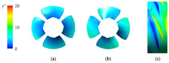 Distributions of y+ on blade surfaces and rotor chamber wall: (a) pressure surface; (b) suction surface; (c) rotor chamber.