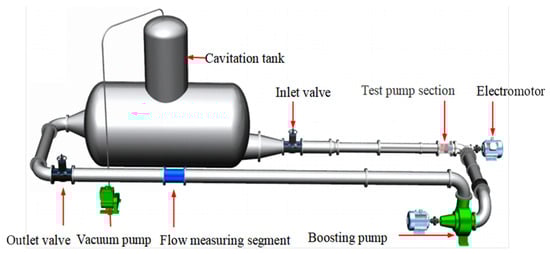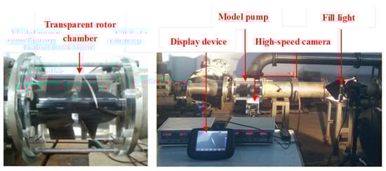 In this paper, the active cavitation method is employed to induce cavitation in the test pump. Firstly, water is injected into the system to an appropriate level. Secondly, the air in the inlet and outlet pressure transmitters is expelled and the pressure transmitters are adjusted to the same horizontal height to eliminate the position difference. Thirdly, the coupling connecting bolts are removed, the motor is run at no load, and the torque is set to zero. Following that, the booster pump gets cranked up and the flow valve is tweaked to the testing flow rate. Once the pressure sensors at the inlet and outlet reach a steady state, the pressure readings, torque, and any other pertinent metrics are meticulously documented. For the performance tests, the flow valve is adjusted to different flow conditions and, after stabilization, the parameters for each flow rate are recorded. In conducting cavitation studies at different flow rates, the previously described procedures should be repeated. Once the system is up and running smoothly, the valve that links to the atmosphere gets sealed shut and the vacuum pump is turned on to suck the air out of the water storage tank, thereby lowering the pump’s inlet pressure. The pressure readings on the pump’s gauge are documented, and a high-speed camera session is initiated at the same time. The experiment is repeated multiple times to ensure the accuracy of the measurements. After the experiment ends, curves for the external characteristics and cavitation characteristics are plotted.