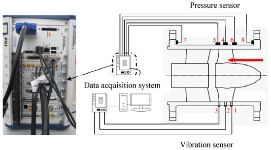 The tests on the performance and high-speed imaging of the axial flow pump were conducted at the closed test facility shown in Figure 4. The test setup included a water tank, vapor erosion tank, vacuum pump, inlet and outlet gate valves, inlet piping, motor, torque meter, model pump test section, outlet piping, booster pump, and turbine flowmeter. Figure 5 illustrates the high-speed photography experimental system, which employs a fully transparent plexiglass runner chamber to enable clear visualization of the impeller flow field for experimental imaging. The high-speed camera used for the experiments is the i-speed3, with a sampling frequency of 4000 Hz to achieve clearer images. The pressure pulsation and vibration measurement experiments are conducted using a stainless-steel impeller runner chamber. The layout of pressure pulsation and vibration sensors is shown in Figure 6. Transient pressure measurements were conducted using piezoelectric PCB 113B28 high-frequency pressure sensors (manufactured by PCB Piezotronics, Inc., New York, NY, USA), with 1, 2, and 3 corresponding to monitoring points P1, P2, and P3. Pressure sensors are installed by drilling pressure measurement holes on the runner chamber. The measurement range of the sensors is 0.69–690 kPa, with a sensitivity of 14.5 mV/kPa. The vibration acceleration sensors used are PCB 356A17 high-frequency vibration sensors (manufactured by PCB Piezotronics, Inc., New York, NY, USA), with a measurement range and sensitivity of 51 mV/(mm∙s−1). They were placed at positions 4–8, as shown in the diagram. The PXI data acquisition system and LabVIEW platform from National Instruments (NI) in the USA are used to experimentally measure signals such as pressure pulsations and vibrations under different flow rates and cavitation conditions.
