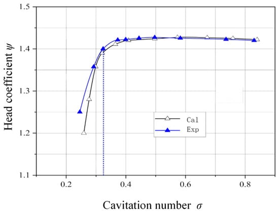 The flow coefficient Φ values corresponding to Q/Qopt = 1.2, 1.0, and 0.8 are 0.63, 0.52, and 0.42. Figure 8 displays the cavitation performance curve under normal operating conditions (Φ = 0.52). The graph reveals that as the cavitation number drops, the head coefficient experiences a modest rise. This occurs because, during cavitation’s early phases, a limited number of bubbles form on the blade surfaces. These bubbles cling to the blades, effectively creating a smoother surface that enhances performance. The friction resistance between the fluid and the smooth blade surface decreases, resulting in reduced losses. As the inlet pressure continues to drop, cavitation bubbles multiply across the blade surface and near the tip. These bubbles disrupt the flow, creating turbulence that throws the system into chaos. The resulting instability degrades the pump’s head performance and reduces the blade’s efficiency in energy transfer. When the cavitation number falls below a critical threshold, the head on the cavitation curve drops sharply, exhibiting a steep gradient. This critical point is defined as the critical cavitation number σc at the current flow rate, with a common criterion of a 3% decrease in pump head used to define the cavitation critical point. A lower cavitation number correlates with a more pronounced decrease in head and a sharper slope, resulting in a more substantial reduction in pump efficiency. Analysis of the results obtained from numerical calculations and experiments shows that the maximum error does not exceed 5%, indicating that the simulations presented in this paper are relatively accurate.