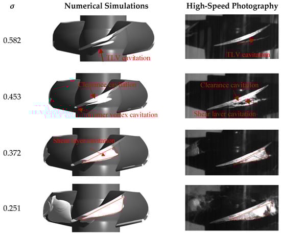 The intricate cavitation phenomena near the blade tip disrupt the primary flow, leading to partial flow obstruction and diminished pump efficiency. To visualize the tip cavitation at four distinct cavitation conditions, we employed both numerical models and high-speed photography. Figure 9 illustrates the cavitation morphology at the tip of the blade of an axial pump as a direct outcome of these methods, recorded under the operating condition of design flow rate Φ = 0.52.