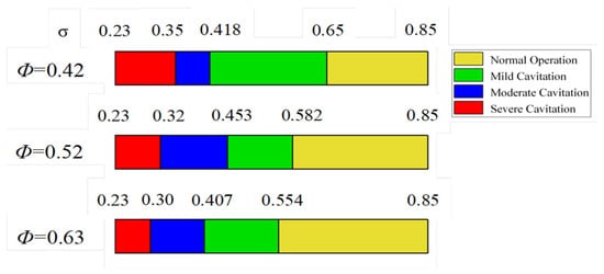 At a cavitation number of σ = 0.582, elongated TLV cavitation and tip vortex cavitation are observed in the blade-tip region, with a cavitation-area coefficient s* = 5.2%. Contrastingly, the flow passage exhibits no major cavitation activity. The cavitation’s influence on the pump’s overall performance is rather minimal. When the cavitation number is reduced to σ = 0.453, the cavitation-area coefficient s* increases to 11.4% and pronounced corner vortex cavitation emerges at the leading-edge corner between the blade tip and the end-wall. The tip vortex cavitation further develops and interacts with TLV cavitation, forming a shear-layer cavitation structure. When σ = 0.372, corner vortex cavitation intensifies markedly, and the cavitation-area coefficient s* rises to 13.6%. The tip vortex cavitation extends along the chord length of the blade. At this point, the cavitation structure evolves into a triangular cavitation structure consisting of TLV cavitation, tip vortex cavitation, and shear layer cavitation. Additionally, attached sheet cavitation also occurs on the suction surface of the blade. When σ = 0.251, the cavitation-area coefficient s* reaches 16.9%, with the triangular cavitation cloud spanning nearly the entire blade-tip region and unsteady shedding vortex cavitation forming at the blade trailing edge. The area of attached sheet cavitation on the blade’s suction surface continues to expand. The extensive cavitation on the blade surface and the tip cavitation cloud interact with the mainstream, resulting in an unsteady flow field. The extensive cavitation impedes the flow, thereby reducing the impeller’s operational efficiency and significantly degrading the pump’s performance. The high-speed photography is a reasonable and accurate method for determining the cavitation inception point. However, due to its high requirements for the test object and test environment, it is only suitable for limited applications. To effectively analyze how signal patterns shift across various cavitation phases, we categorize the cavitation intensity into four distinct levels: standard operation, slight cavitation, intermediate cavitation, and extreme cavitation. This classification is derived from high-speed imagery and bolstered by numerical simulations. Figure 10 presents the cavitation coefficients associated with these four operational states at varying flow rates.