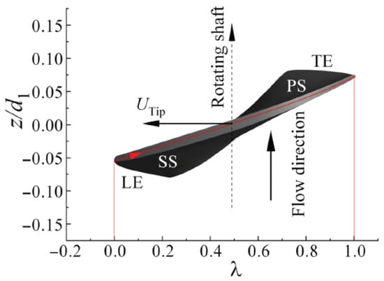 where l refers to the length from the outer margin of the blade’s leading edge to the axis of the blade at each chord’s transverse section, mm; and c represents the total length from the blade’s leading edge to its trailing edge, mm.