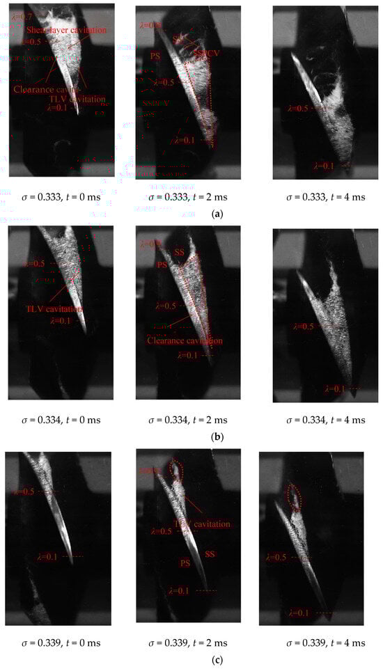 Both Figure 12 and Figure 13 are results captured from high-speed photography experiments. Figure 12 shows the transient evolution of cavitation in the tip region at a lower cavitation number, spanning from 0 ms to 4 ms. The red dashed lines in the figure correspond to different chord length coefficients. From Figure 12a, it can be seen that in the flow condition of Φ = 0.42, the cavitating structures within the tip region consist of TLV, clearance, and shear layer cavitation, which coalesce into a large triangular cloud. The trailing edge of the cavitation cloud is originally located at λ = 0.7. Within the λ range of 0.5 to 0.7, unstable vortex cavitation constitutes the cavitation phenomenon. As the impeller rotates, the unstable vortex structures at the trailing edge of the cavitation cloud dissipate and detach, forming a vertical cavitation vortex (SSPCV) perpendicular to the suction surface of the blade at t = 2 ms. Under design conditions (Φ = 0.52), the tip cavitation cloud initially forms at λ = 0.1 and remains stably attached between λ = 0.1 and λ = 0.7. The cavitation morphology and coverage exhibit minimal temporal variation across different instantaneous time frames. However, two oscillating cavitation wakes are observed downstream of the primary cavitation cloud. These wake structures demonstrate continuous shape modulation while maintaining coherent attachment to the trailing edge of the primary cavitation cloud without detachment. The triangular cavitation cloud is notably smaller than that depicted in Figure 12a, and the tip leakage vortex forms a smaller angle with the blade chord. Under high-flow conditions (Φ = 0.63), the tip leakage vortex originates at the blade chord length coefficient λ = 0.5. The cavitation pattern primarily consists of tip-leakage vortex cavitation and clearance cavitation, with cloud cavitation being less pronounced. At distinct instantaneous time points, the scale and intensity of the cavitation vortex structure associated with the tip leakage vortex show minimal variation. This observation indicates that under low-flow conditions, the unstable flow phenomena within the pump enhance the transient characteristics of cavitation in the tip region.