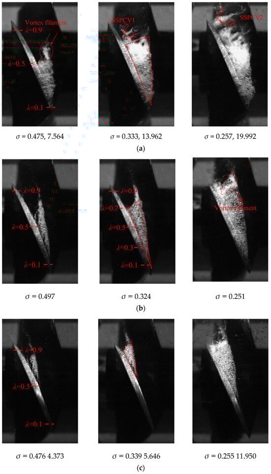 Transient cavitation patterns of lower cavitation numbers at different flow rates: (a) Φ = 0.42; (b) Φ = 0.52; (c) Φ = 0.63.