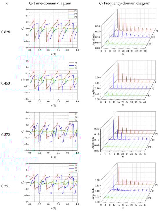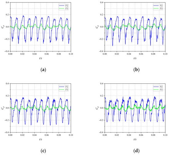 Based on pressure fluctuation measurements, the experimental monitoring points P2 and P3 are selected for analysis. Four cavitation cases at Φ = 0.52 are analyzed, with σ values of 0.497, 0.399, 0.324, and 0.246. Comparative analysis is conducted on the pressure fluctuation monitoring points P2 and P3. Figure 15 shows relatively consistent pressure fluctuation patterns within the impeller. There is a temporal offset between the peaks and troughs of the experimental monitoring points P2 and P3. This is attributed to the pressure fluctuation sensors being installed parallel to the rotational axis, such that the impeller inlet first passes through monitoring point P2 before reaching monitoring point P3. At monitoring location P2, the blade tip’s excessive gap has led to a substantial secondary surge, which shows up as the blade moves from its pressure side to the suction side. As the flow shifts from the suction surface toward the pressure surface, secondary fluctuations emerge in the pressure coefficient’s recovery phase on the waveform diagram. This occurs because of the interplay between tip-leakage vortex cavitation and shear layer cavitation, which disrupts the smooth pressure transition. Furthermore, as the cavitation number decreases, the frequency of secondary fluctuations increases during the recovery from the trough to the peak. This is because when the cavitation number is low, the area of the triangular cavitation cloud region at the blade tip increases, and the intensities of tip clearance cavitation, TLV cavitation, and shear layer cavitation increase, resulting in more secondary fluctuations during the recovery of the pressure coefficient at monitoring point P2.