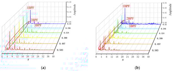 As shown in Figure 16, the frequency-domain distributions of pressure fluctuations under the design condition are presented. The dominant frequencies at monitoring points P2 and P3 are the blade passing frequency (BPF) and its harmonics. Under varying cavitation conditions, a low-frequency component with N = 3 is observed at monitoring point P2. At monitoring point P3, low-frequency components with N = 1 and N = 3 are detected. As the cavitation number drops to σ = 0.221, high-frequency signals at P3 intensify. This is because at lower cavitation numbers, the cavitation area at the blade tip increases. Monitoring point P3 is positioned at the impeller outlet’s trailing edge, where cavitation patterns are prone to instability. At monitoring point P3, N = 1 corresponds to a shaft frequency of 1450 rpm, which is associated with the impeller rotation. This indicates that, besides the dominant impeller frequency, this monitoring point is also significantly influenced by the shaft frequency. Since monitoring point P3 is situated at the impeller outlet’s trailing edge, its frequency domain traits are significantly shaped by the shaft’s rotational frequency. Additionally, the amplitude variations in the frequency domain are relatively small. Therefore, monitoring point P2 is selected for further signal analysis in the following sections.