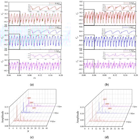 As shown in Figure 17, the time-domain and frequency-domain plots of the pressure coefficient at P2 under two typical cavitation conditions are presented. The corresponding cavitation numbers are 0.399 and 0.221, respectively. Figure 17a,b show the time-domain plots under different flow rates. Figure 17c,d display the frequency-domain plots after Fast Fourier Transform (FFT). The insets in the figures capture the transient pressure behavior within one impeller revolution. As the impeller rotates, monitoring point P2 moves from the pressure side of the blade to the suction side. The transient pressure coefficient fluctuates between peaks and troughs. As the flow rate decreases, the peak-to-peak value gradually increases. The transient pressure fluctuations become more pronounced. Especially under severe cavitation conditions, during one-quarter of an impeller revolution, as the pressure coefficient rises from the suction side to the pressure side of the blade, the pressure fluctuation characteristics are even more significant. This shows that the tip area in these cavitation circumstances is affected by complex TLV cavitation and unstable SSPVC shedding and dissipation. After FFT transformation, frequency-domain analysis of monitoring point P2 is conducted. Throughout the various phases of cavitation, the primary frequencies of pressure oscillations consistently align with the blade passing frequency and its harmonic multiples. However, as the flow rate rises, the intensity of these dominant frequencies diminishes accordingly. The data indicates that with an elevated flow rate, the pressure differential across the pressure and suction sides diminishes. Therefore, the cavitation performance is better under high-flow-rate conditions via the intensity of the tip leakage flow. At the same cavitation stage, lower flow rates are associated with larger amplitudes. The frequency characteristic fluctuations of high-frequency components are more significant. Furthermore, the noise levels were observed to increase correspondingly. This indicates that the entrainment and disturbance between the cavitation morphology in the tip region and the mainstream are stronger at lower flow rates. The unstable flow field structure in the tip region is more complex.