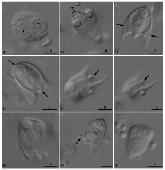- Kodádková, A.; Bartošová-Sojková, P.; Holzer, A.S.; Fiala, I. Bipteria vetusta n. sp.—An old parasite in an old host: Tracing the origin of myxosporean parasitism in vertebrates. Int. J. Parasitol. 2015, 45, 269–276. [Google Scholar] [CrossRef] [PubMed]