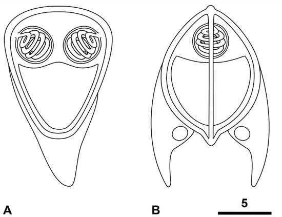 - Liu, Y.; Lövy, A.; Gu, Z.; Fiala, I. Phylogeny of Myxobolidae (Myxozoa) and the evolution of myxospore appendages in the Myxobolus clade. Int. J. Parasitol. 2019, 49, 523–530. [Google Scholar] [CrossRef]