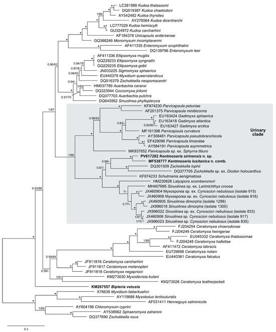 Almeida, T.; Rangel, L.F.; Sá, M.; Araújo, C.; Santos, M.J.; Rocha, S. Description of Kentmoseria sirinensis n. sp. and Kentmoseria lusitanica n. comb. (Sirin et al., 2018) (Cnidaria, Myxosporea) from Common Two-Banded Seabream Diplodus vulgaris (Teleostei, Sparidae). J. Mar. Sci. Eng. 2025, 13, 1401. https://doi.org/10.3390/jmse13081401