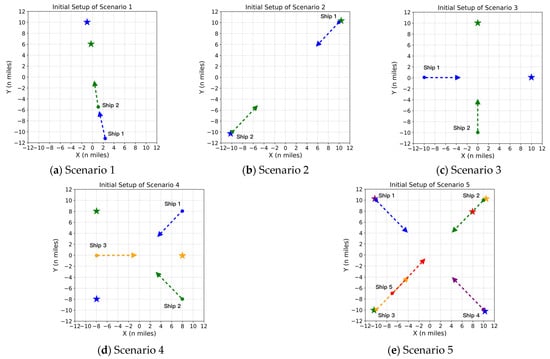 | Scenario | Ship ID | Initial Position | Destination | Course (°) | Speed (Knots) | Relationship with Collision Risk |